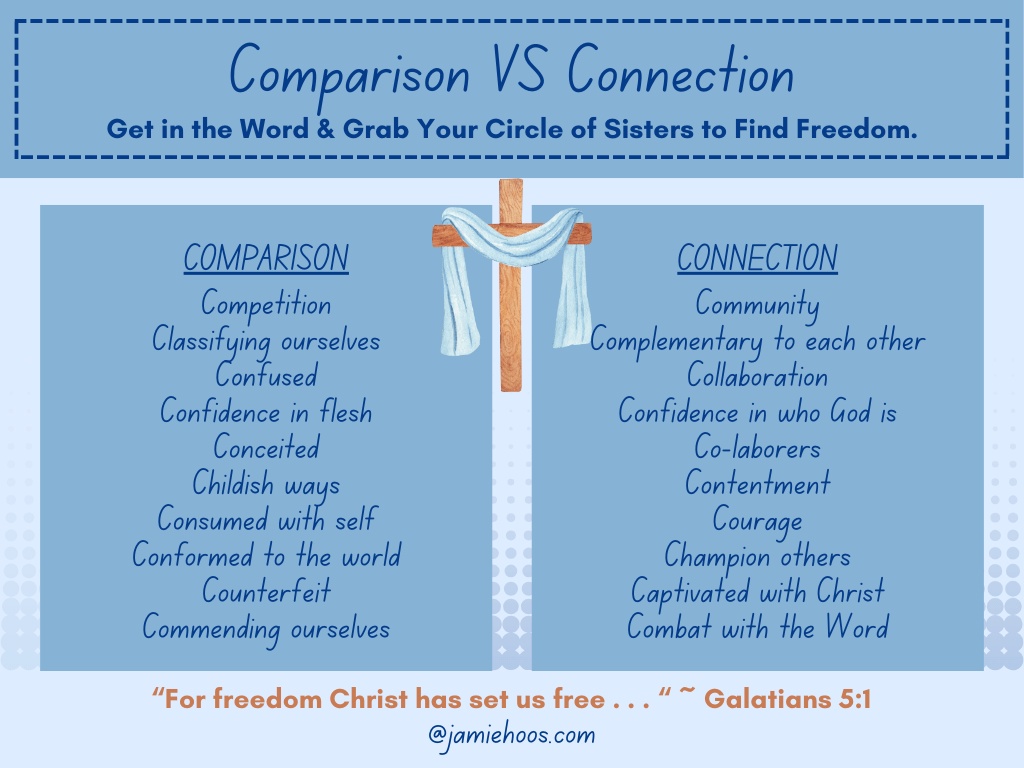 At the Wild & Free Women’s Conference, I spoke on this topic. At this amazing event, we kept hearing the Lord say that surrender is the way to freedom–from the testimonies to the main teachings to the music–it was a theme! And then came the breakout sessions where the Spirit had His way again. In my session, we found ourselves challenged to break the cycle of comparison with two things: the Word of God and our circle of sisters. We looked at Scripture that continually points us to connection with and in Christ and with and in community. All the C’s from the session came together to look like this, with the Cross (the Gospel of Christ) in the middle: