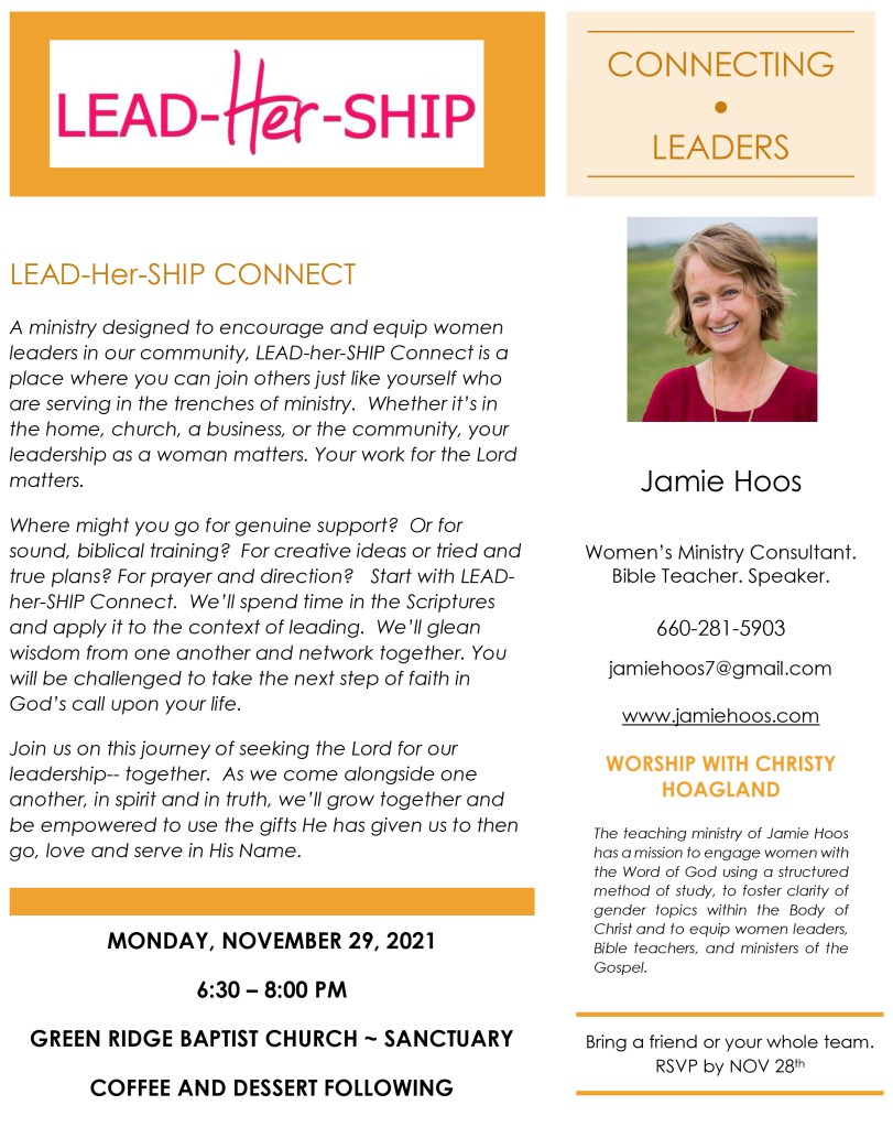 Lead-HER-Ship exists to encourage and equip women leaders within the local church context and the community and beyond. It includes Lead-HER-Ship Connect, which are quarterly meetings for women in the Central MO area who want the opportunity to network with other leaders and be encouraged in the ministry. Lead-HER-Ship also includes The Institute, which are workshops and courses that are focused on training women in ministry. Areas of study include biblical literacy, how to study the Bible, an apologetic of women’s ministry, vision casting and follow through, organizing ministries, and personal ministry effectiveness. These courses may be offered locally at venues, or brought directly to your church.